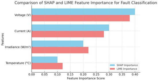 Machine learning models for photovoltaic (PV) fault detection often function as black-box classifiers, making it difficult to interpret their decision-making process. To address this challenge, Shapley Additive Explanations (SHAPs) [34] and Local Interpretable Model-Agnostic Explanations (LIMEs) [35] are applied to understand which input features contribute most to classification outcomes. Both methods provide insights into feature importance, helping assess how variations in voltage, current, irradiance, and temperature impact the model’s ability to detect faults accurately. SHAP is a game theory-based method that assigns importance values to each feature by considering all possible feature combinations. It computes Shapley values, which measure the contribution of each feature to the final prediction. One of SHAP’s advantages is that it provides both global (overall feature importance across all instances) and local (instance-specific) explanations. This dual capability allows for a comprehensive understanding of the classifier’s behavior, making it particularly useful for complex models like Gradient Boosting, deep learning, and ensemble classifiers. LIMEs, on the other hand, is a perturbation-based approach that explains predictions by slightly altering feature values and observing how the model’s decision changes. Unlike SHAP, which computes feature importance across the dataset, LIME focuses on local interpretability, generating approximate explanations for individual instances. While this method is faster and computationally less expensive than SHAP, it lacks the robustness needed for capturing global trends in classification. Figure 11 presents a comparative analysis of SHAP and LIME feature importance scores for PV fault classification. The results indicate that voltage (V) and current (A) are the most influential features in determining whether a fault exists, followed by irradiance and temperature. Both SHAP and LIME agree on the rank ordering of features, but SHAP assigns slightly higher importance values to voltage and current, while LIME gives more weight to irradiance and temperature. This suggests that SHAP provides a more stable and theoretically sound assessment, while LIME may overemphasize localized patterns within the dataset.
