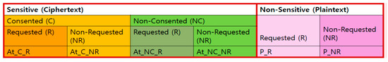 Although these related works suggest various approaches to protect personal information in sharing medical information, they do not directly address the topic that this study intends to propose. In particular, there is a still lack of research on how to systematically implement the data minimization principle in a medical information sharing environment. Encryption-based approaches ensure data confidentiality, but most of them treat all attributes with the same level of security, which does not effectively implement the ‘data minimization’ principle. Specifically, existing studies do not provide a mechanism to selectively share information according to patient consent, request for sharing, and data sensitivity. DtMin, proposed in this study, attempts to overcome these limitations by combining multi-type attribute classification and attribute-based encryption.