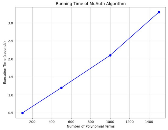 When the number of patients exceeds 1000, the authentication time increases to over 2 s, necessitating a scalable authentication mechanism for large patient groups. Developing a strategy to generate and manage multiple authentication polynomials hierarchically can efficiently handle a large user base.