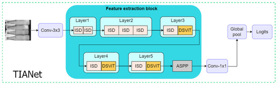 The TIANet architecture begins with the input image, where initial processing is carried out using convolutional layers. Next, enter the feature extraction block to extract image features, which is composed of the ISD block, DSViT block, and ASPP block, which are used to further extract and fuse local features and global features, and perform multi-scale feature extraction through the ASPP module to further capture contextual information. Eventually, the aggregated features are passed through a convolutional layer to adjust the channel count, followed by a global pooling layer and classifier to produce the final predictions. By leveraging the strengths of both CNN and ViT, the model effectively extracts local features while capturing global context, enhancing its performance and accuracy.