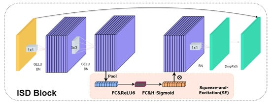 Figure 2 illustrates the detailed structure of the ISD block. Initially, the input tensor increases the number of channels via a pointwise convolution (PW Conv2D), which is then processed by batch normalization (BN) and the Gaussian Error Linear Unit (GELU) activation function. This step increases the channel dimension of the input feature map, enhancing its representational capacity. In a high-dimensional space, a deep convolution is performed with the number of channels kept constant, while using batch normalization and GELU activation functions. Subsequently, the attention weights are multiplied by the original feature map element by element through the SE module to complete the feature recalibration between channels. Then, a pointwise convolution reduces the dimensionality of the number of channels to restore it to the original dimension. To mitigate overfitting, the DropPath mechanism randomly drops the computational results of certain channels and calculates the output after path-discarding by multiplying and scaling with the randomly generated reserved mask, so as to enhance the generalization ability of the model. Finally, the ISD block uses residual connections to merge inputs and outputs, enabling the model to capture higher-level features while preserving the original feature information. Throughout the process, the integration of the IR, SE, and DropPath mechanisms enhances local feature extraction and channel characterization, while ensuring computational efficiency and reducing overfitting.