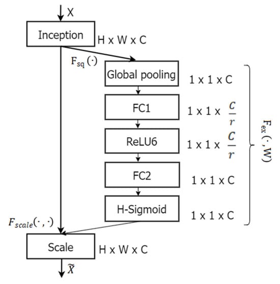 In the excitation () stage, the vectors generated in the extrusion stage are fully connected by two layers (implemented as convolutions, respectively). The output dimension of of the first fully connected layer is of the number of channels, and after applying the ReLU6 activation function, the number of channels is restored back to C by of the second fully connected layer, and the attention weight of each channel is generated by the H-Sigmoid activation function. The calculated weights are applied to reweight the individual channels of the original feature map. The formula is shown in Equation (2):