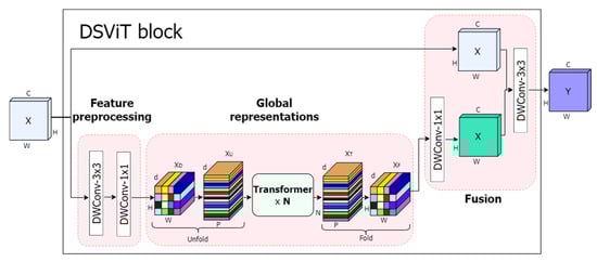 The CNN network is excellent in extracting local features, but due to the high feature instability of image defects in the industrial field, CNN performance is not as expected when dealing with tasks that require global features, and the limitations of convolution kernel hinders CNN’s ability in global feature extraction. The Transformer module can extract features from the global scope through the self-attention mechanism, which compensates for the shortcomings of CNN in global feature extraction. To this end, the DSViT module is used in this paper, which is combined with depth separable convolution by Vision Transformer to achieve global feature extraction of defects. The structure of the DSViT block is shown in Figure 4, and efficient representation learning is achieved through the combination of three submodules: feature preprocessing, global feature encoding, and feature fusion.