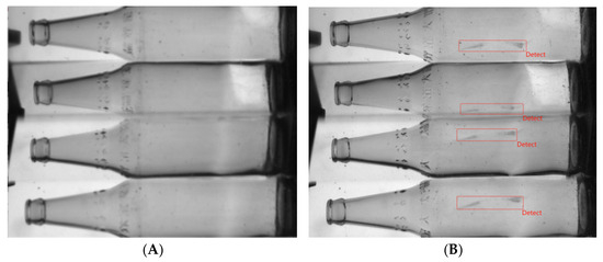The dataset used in this paper is provided by Shandong Mingjia Technology Co., a cooperative enterprise of the project, and the data acquisition equipment is the industrial camera DASAL Genie Nano-1GigE, with a resolution of 1280 × 1024 and a frame rate of 35 fps. The backlight is used to illuminate, and multiple sets of mirrors are used to reflect at different angles to obtain the maximum angle of the bottle image. Through two bottle detections before and after, one camera with four viewing angles, a total of eight viewing angles, so that the 360-degree bottle body of each bottle is covered.