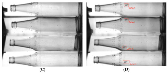 Types of glass bottles. (A) Front qualified; (B) Front unqualified; (C) Rear qualified; (D) Rear unqualified (the defects are marked in sub-figures (B,D)).