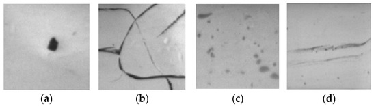 The different categories of bottle wall images are shown in Figure 6. Among them, there are 282 qualified images on the front side, 608 unqualified images on the front side, 253 qualified images on the back side, and 429 unqualified images on the back side, with a total of 1572 glass bottle wall images. Among them, the defect category in the non-conforming image is shown in Figure 7 and contains the following: (a) Plaque: foreign stone particles embedded in the glass, which will reduce the quality of the bottle; (b) Crack: refers to the deformation or cracking of the surface of the bottle, which may affect the structural integrity of the bottle; (c) Stolen goods: refers to the stolen goods remaining in the bottle during use or cleaning; (d) Scratches, i.e., scratches on the surface of the bottle, which can affect the strength and appearance of the bottle.