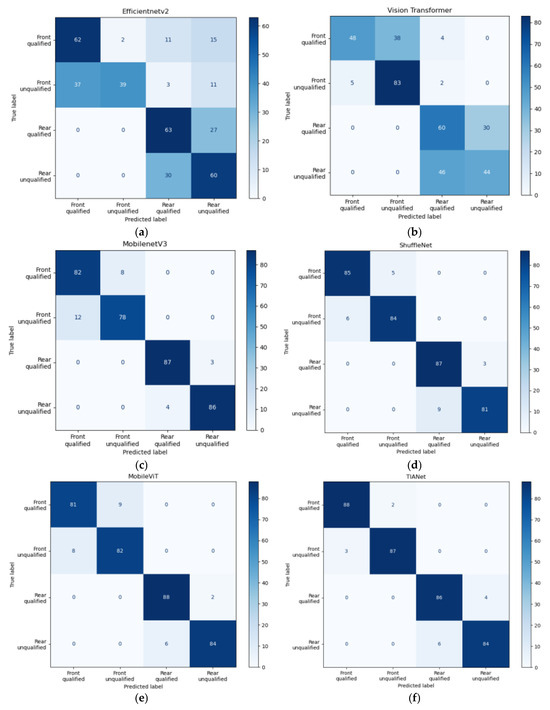 Confusion matrix of defective glass bottle classification results for various network structures. (a) EfficientNetV2; (b) Vision Transformer; (c) MobileNetV3; (d) ShuffleNet; (e) MobileViT; (f) TIANet.