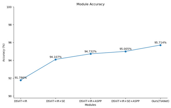 The experimental results are shown in Figure 9. From the results, it can be seen that when using only the DSViT fusion inverse residual structure as the baseline network, the accuracy value is relatively low, at 91.786%. When the SE mechanism is integrated, the network will have the ability to capture differential features between different channels at specific locations. It improved the accuracy, reaching 94.107%. After further integration of the ASPP module, the network can effectively perceive defects of different shapes and sizes with an accuracy of 95.005%. Finally, after adding the DropPath mechanism, the accuracy of the network increased to 95.714%. The ablation experiment proves that a method for feature extraction, multi-scale fusion, and classification performance has been proposed.