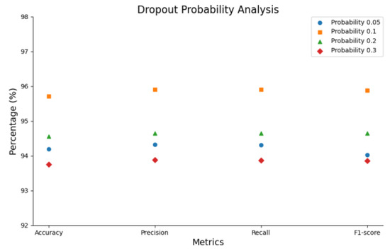 The path drop mechanism prevents overfitting and accelerates training by setting the probability of dropping, randomly dropping the entire path in certain layers, and not updating the parameters in those paths during backpropagating. In this part, various drop probabilities are applied to the network, and experiments are conducted to achieve optimal outcomes. The performance results are illustrated in Figure 10, showing noticeable changes depending on different path drop probabilities. Specifically, when the drop probability is set to 0.1, the model attains its maximum accuracy of 95.714%. However, as the drop probability increases to 0.2 and 0.3, all performance metrics start to decline. In particular, at a drop probability of 0.3, the performance metrics reach their lowest values. This indicates that higher drop probabilities may hinder the network’s learning ability, leading to poorer performance.