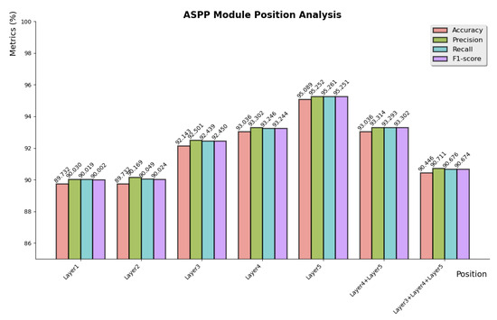 Based on practical experience, this study assumes that the ASPP module will achieve the best results when applied to the middle layer of the baseline network. In order to test this hypothesis, the ASPP module is inserted into different positions after each layer stage, and a series of experiments are conducted. The results are shown in Figure 11. Initially, ASPP modules were inserted separately after each stage to evaluate the classification performance of each network separately. According to Figure 11, the performance of ASPP modules is poor when inserted after Layer 1 and Layer 2 and improved after other phases. The potential degradation of performance after the Layer 1 and Layer 2 phases may be due to the fact that the shallow layers of the network have not yet fully learned the basic features of the image, and the addition of ASPP may introduce noise information, which may affect the overall performance. Further tests on the combination of different stages showed that inserting the ASPP module after the Layer 5 stage worked best, with a recognition accuracy of 95.089%.