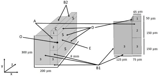 Geometry used in the COMSOL simulation showing used materials (platinum (1), water (2), and silicon (3)), dimensions, and boundary conditions. Boundary conditions are the inlet parabolic velocity profile for the fluidic channel (A), heat loss modeled as an outflux of 953 Wm−2K−1 (B1) and 10 Wm−2K−1 (B2), heat source of 300 mW (C), thermally insulating surfaces (D), and no viscous stress (E) on the appointed channel wall. (O) The origin of the channel. (S) The symmetry plane of the geometry.