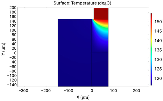 Cross-sectional simulation image of the fluidic channel with microheater. The image shows the temperature distribution within the channel. The power applied to the heater during the simulation was 1.13 W. Image taken at z = 200 µm.