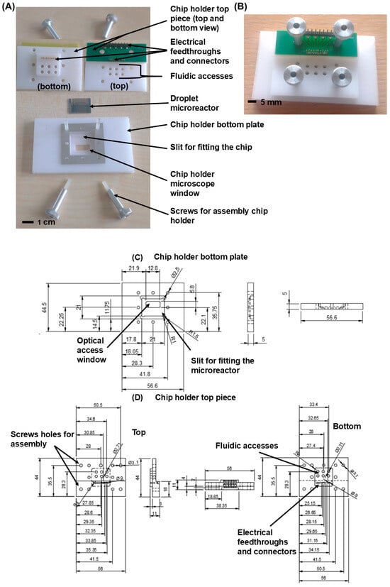 (A) Exploded view of the chip holder showing all the individual components. (B) The assembled chip holder. (C,D) CAD drawing (with all dimensions) of the chip holder bottom plate and top piece.