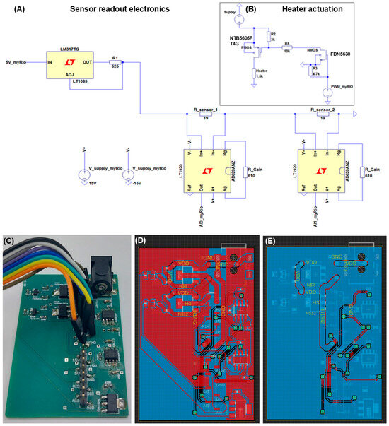 (A) Electrical read-out circuit used for measurement and amplification of the voltage across both temperature sensor structures (TS1 and TS2; Copyright © 2023, the author(s), under Creative Commons CC-BY License. Adapted from the SI of [17]). (B) Heater actuation circuit. (C) Image of the PCB that is used for read-out and control of the temperature sensors and microheaters. (D) Routing on the frontside of the PCB as designed in eagle. (E) Routing on the backside of the PCB as designed in eagle.
