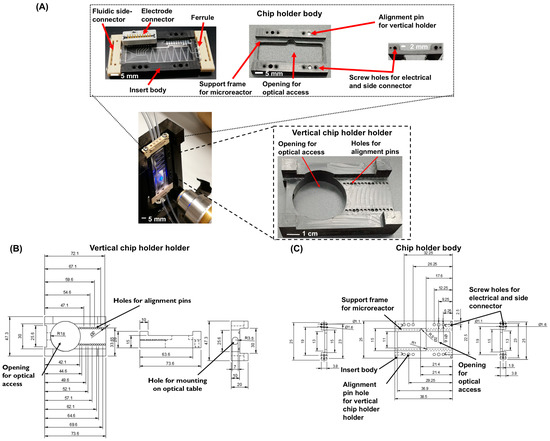 (A) Images of the microreactor side connect holder (top row) and the vertical chip holder holder (bottom row) for placement of the microreactor in front of the optical set-up (B,C) CAD drawings (with all dimensions) of the chip holder and the chip holder body.