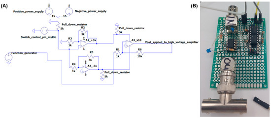 As shown in Figure 7, the circuit consists of three operational amplifiers (opamps, TL081CP, Texas Instruments, Dallas, TX, USA), of which the first two are symmetrically in power by the +15 V and −15 V power supply ports of the myRIO DAQ. These two opamps amplify the DEP pulse from the myRIO output port (3.3 V) by a factor +3 for one (non-inverting) amplifier and a factor −3 for the other (inverting) amplifier. A pull-down resistor is connected to the DEP pulse pin to regulate the signal back to 0 V when the DEP trigger signal goes from active to inactive. The amplified DEP trigger is used to power the third opamp that amplifies the signal from the function generator by a factor 10. This signal is then applied to the Trek 2210 amplifier. Pull-down resistors are added to the power lines of the third opamp. The DEP trigger can be set in the software. It was found that a trigger signal of 95 ms during which 600 VDC is applied to the DEP electrodes is most optimal for the sorting of droplets.