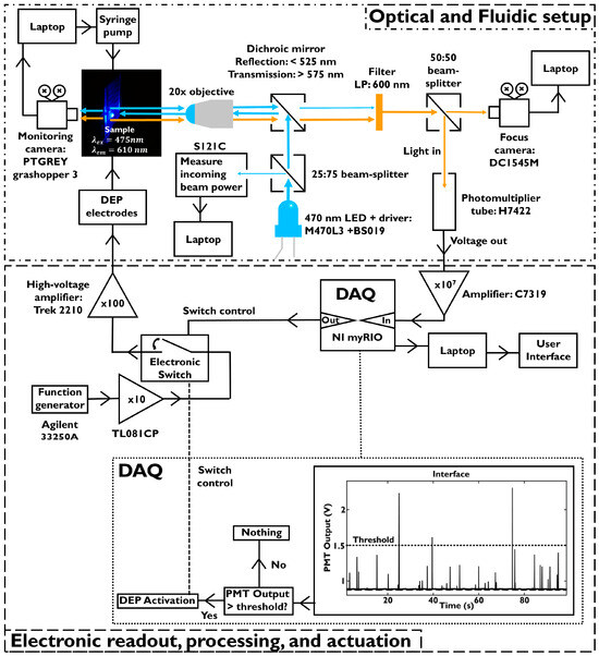 Top: Detailed schematic of the optical and fluidic set-up. Bottom: Schematic of the electronic processing and internal decision scheme of the DAQ and DEP activation.