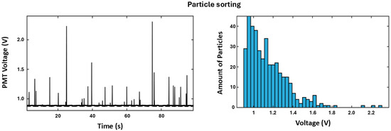 Figure 8 shows the combination of the optical and fluidic set-up and the electronics, including software decision making. For the training of the platform, we let the PMT detect multiple particles over time. These data were used to obtain the background signal (0.92 V) and create a histogram that shows the distribution of the maximum of the voltage peak versus the peak heights (Figure 9). This histogram shows the same distribution as with the fluorescence intensity detection set-up for the activity screening (Figure 5 in Section 3.1.4). This confirms that both platforms are capable of detecting the population distribution for the same fluorescent probe (4-methoxystyrene).