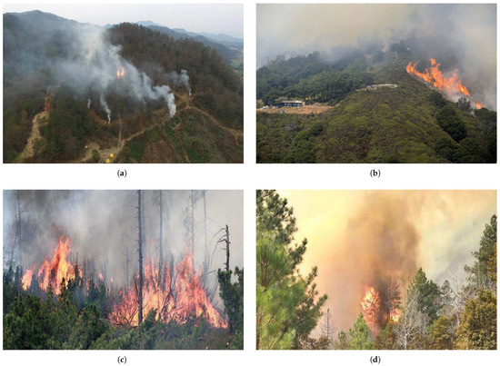 The majority of the fire images in the dataset contain prominent fire-related features, such as flames and smoke [25,26]. These features are often direct manifestations of fires, making them highly distinguishable. The presence of flames typically indicates the spread of fires and the intense release of heat, while smoke signifies that fires are ongoing and releasing harmful gases. In addition to flames and smoke, fire images may include remnants of burning materials, damage to buildings or forests, and the impact of fires on the surrounding environment. Flames typically display vibrant colors, such as yellow, orange, and red, during combustion, and, in forest fires, the shape of the flames can vary. Smoke, on the other hand, is primarily black, gray, or white and exhibits high concentration and dynamic variation, often showing diffuse and spreading characteristics. Therefore, flames and smoke are the primary visual features used to identify the occurrence of forest fires. Figure 1 illustrates representative samples from the forest fire dataset.