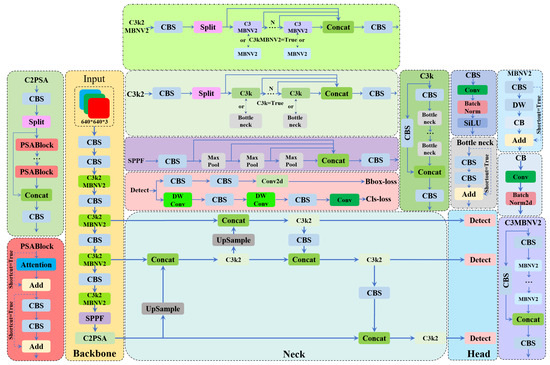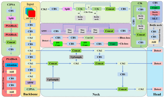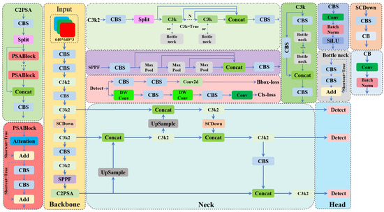 To address this issue, we integrate the SCDown [32] block into the backbone and neck structures of YOLOv11. The SCDown block first adjusts the input feature map’s channel dimensions via pointwise convolution while preserving spatial resolution. Next, a depthwise separable convolution layer downsamples the spatial resolution, retaining channel-wise information. Finally, the output feature map has reduced spatial dimensions but maintains the original channel count. By independently processing spatial information per channel during downsampling, the SCDown block mitigates information loss common in traditional convolutions and preserves fine-grained details. This design enhances multi-scale feature fusion by effectively combining shallow and deep features. As a result, the model achieves higher detection accuracy in complex scenarios and improved small-target recognition. Additionally, depthwise separable convolution reduces computational costs by operating on individual channels instead of all channels simultaneously, as in standard convolutions. The overall architecture with the SCDown block is illustrated in Figure 4.