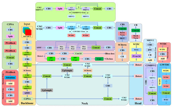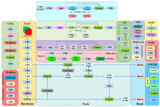 Building on this, we designed the wavelet transform pointwise convolution (WTPC) block to enhance feature extraction efficiency. In the WTPC layer, a 1 × 1 convolutional kernel processed the feature maps from the WTC layer, adjusting channel dimensions and fusing channels while retaining spatial details and reducing computational costs (e.g., FLOPs). This design ensures efficient utilization of multi-scale features while minimizing model complexity. In the wavelet transform depthwise convolution (WTDC) layer, depthwise convolution was applied to the WTPC output. Unlike standard convolution, depthwise convolution independently operates on each channel, drastically reducing computations. This method optimizes efficiency while preserving per-channel feature representations, enhancing robustness for detecting flames and smoke across scales. By integrating wavelet transforms with multi-convolution operations, we constructed the C3k2WTDC block. This block improves multi-scale feature extraction and reduces computational overhead without sacrificing accuracy. The enhanced network architecture is illustrated in Figure 5.