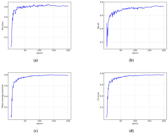 Training progress curve: (a) precision of our model. (b) Recall of our model. (c) mAP50 of our model. (d) F1-score of our model.