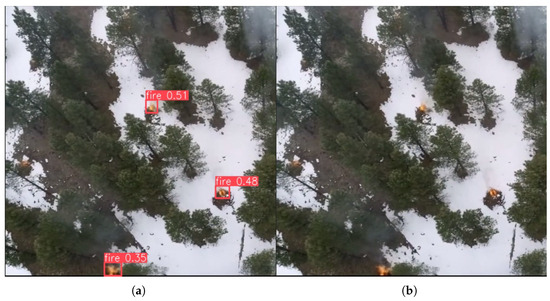 Comparison of fire detection model performance in detecting small-target flames: (a) detection performance of the fire model trained on our dataset for small-target flames. (b) Detection performance of the fire model trained on the FASDD_UAV dataset for small-target flames.
