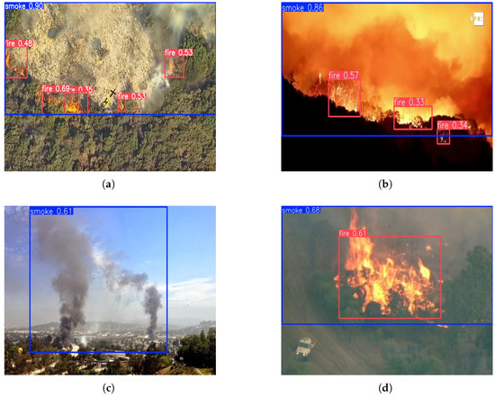 Performance of our fire detection model tested under various environmental conditions: (a) sunny. (b) Night. (c) Cloudy. (d) Hazy.