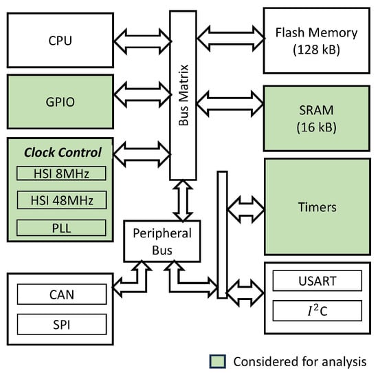 An STM32 microcontroller [] is used as a device under test (DUT), and it consists of a 32-bit ARM Cortex-M0 Central Processing Unit (CPU). Its architectural layout is illustrated in Figure 1. The controller operates with a High-Speed Internal (HSI) clock, with frequencies of 8 MHz and 48 MHz, supplemented by a phase-locked loop (PLL) circuit multiplying the frequencies up to a maximum frequency of 48 MHz. The microcontroller has 16 kB of RAM and 128 kB of flash memory. It consists of 8 timers and supports various communication interfaces such as a Controller Area Network (CAN) and a Serial Peripheral Interface (SPI), an Inter-Integrated Circuit (C), and a Universal Synchronous/Asynchronous Receiver/Transmitter (USART). The general-purpose input/output (GPIO) pins can be configured using these timers for pulse-width modulation (PWM) signal generation.