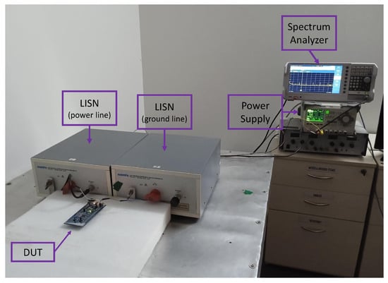 The conducted emission measurement setup comprised the STM32 microcontroller board as the device under test (DUT), powered by a constant 5 V DC supply from a Rigol DP832 programmable DC power supply. Power and ground pins were connected to two Line Impedance Stabilization Networks (LISNs) from Scientific. The conducted emissions were measured at the LISN connected to the power supply line and observed using a Rohde & Schwarz FPC1000 spectrum analyzer (Model: 102718/002), functioning as an EMI receiver. The ground pin of the DUT was connected to the LISN, while the LISN’s output port was terminated with a 50 Ω impedance. The setup followed the CISPR 25 standard [], with some modifications. As per the standard, the cable between the DUT and LISN was 20 cm in length, and the DUT was positioned 5 cm above a grounded metal table using a Styrofoam sheet for insulation. The measurements were performed in a closed, unshielded room. However, the measurement table was properly grounded to minimize interference and ensure measurement consistency.
