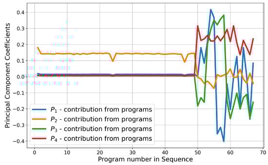 In Figure 5, from the emission envelopes measured for STM32, we select the first four most significant principal components, , as they collectively explain 85% of the variance in the dataset. The programs are sequentially indexed along the X-axis (Program 1 to Program 67), with the Y-axis displaying the corresponding principal component coefficients. The first 49 programs correspond to RAM utilization (Table 1), while the remaining 18 involve GPIO switching (Table 2 and Table 3). The principal component coefficients show minimal variation for the RAM programs, whereas significant variation is observed for the GPIO programs. To compute the upper and lower bounds of the emissions, we use emission envelopes from both the RAM utilization and GPIO switching programs. To better capture the larger variation in the GPIO programs, the combination includes a higher proportion of them.