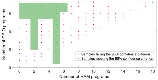 In this section, we present the results of applying the method to the STM32 microcontroller data, generated from the experiments described in Section 2, for the calculation of the emission bounds. The lower and upper bounds ( and ) are computed following the methodology outlined in Section 4.1, ensuring that the emissions remain within these bounds with 95% confidence. In Figure 5, it is evident that a higher proportion of GPIO programs should be included in the analysis. To evaluate the methodology, we randomly select a GPIO-based program as a test case (). The combinations of RAM and GPIO programs that satisfy the 95% confidence interval are identified in a comparison with  using Equation (14). The combinations that meet the criteria of Equation (14) are considered good samples and are plotted in Figure 6.