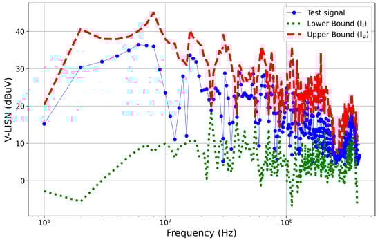 The region containing the suitable combinations (or good samples) of RAM and GPIO programs, which ensure adherence to the 95% confidence criterion, is highlighted in Figure 6. Any combination within the highlighted area can be used to randomly select the corresponding number of RAM and GPIO programs and compute the emission bounds with 95% confidence. For instance, in Figure 7, the emission bounds are calculated using five RAM and sixteen GPIO programs. The test signal fits well within the computed bounds across the entire frequency range. Based on the upper bound, we infer that the microcontroller’s conducted emissions (CEs) remain at nearly 40 dBV up to 40 MHz, decrease to 30 dBV up to 200 MHz, and further drop to 20 dBV up to 500 MHz, with 95% confidence, for any of the programs described in the design of experiments.