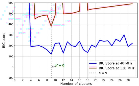 This section presents the results of estimating the conducted emission peaks caused by a new program, characterized by specific program configurations, for the STM32 microcontroller across a frequency range of 1–500 MHz. The program configurations include the RAM utilization percentage, clock frequency, PLL status (on/off), GPIO switching frequency, GPIO duty ratio, and number of active GPIO pins, yielding a total of  input variables for  frequency points. Conditional mixture models are built for each frequency point according to the procedure outlined in Section 4.2. To determine the optimum number of clusters, the model-building process is repeated for different values of K, ranging from 3 to 30 clusters. For each number of clusters, the BIC scores are plotted against the number of clusters for two arbitrarily selected frequency points, 40 MHz and 120 MHz, as shown in Figure 8.