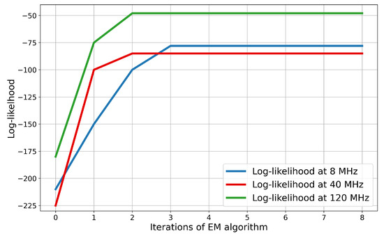 The optimal model is determined by the smallest BIC score, and, based on the observed trend,  clusters are selected as the best model. Using , a conditional mixture model is created following Equations (17)–(23). The expectation (E) and maximization (M) steps are repeated until the model converges. Upon convergence, the EM algorithm maximizes the log-likelihood. Figure 9 illustrates the log-likelihood observed over eight iterations for three frequency points (8 MHz, 40 MHz, and 120 MHz), showing stabilization at a maximum value, which confirms the model convergence.