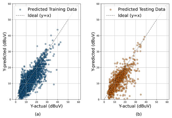 For model building and validation, 80% of the total dataset is used for training the model, while the remaining 20% of the data are used for testing the model. The training phase involves estimating the model parameters at each frequency point—, , and —using Equations (19)–(23), as outlined in Section 4.2. Once trained, the emission peaks of the test data are predicted using Equation (24). The performance of the model is evaluated using two key metrics, namely, the 2-norm error and  score, computed through Equations (25) and (26). During training, the model achieves a root mean squared error of 3.35 dBV and an  score of 0.79, indicating a good fit for the training data. For testing, the root mean squared error increases slightly to 4.45 dBV, with an  score of 0.66, reflecting the model’s ability to generalize to unseen data or predict the emission peaks of the configurations of a new program. Figure 10 presents a comparison of the predicted emission peaks and the actual values (in dBV) for both the training and testing datasets, demonstrating the model’s predictive accuracy across the entire frequency range.