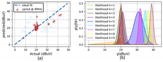 (a) Predicted vs. actual conducted emissions y at 8 MHz. (b) Probability distribution of y for different clusters.