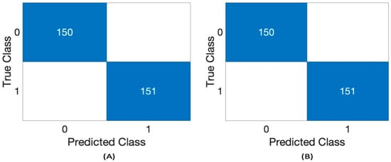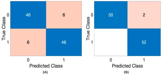 Confusion matrix for binary classification of the Challenge2016 dataset using (A) 4 features and (B) 8 features.