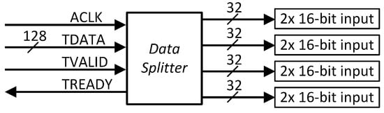 A hardware accelerator can leverage the high bandwidth of an AXI-Stream interface to receive multiple data inputs in parallel. This enables the parallel processing of data. For example, consider a hardware CORDIC [8] module computing only the atan2(imag, real) function, where the imaginary and real parts are 16-bit fixed-point inputs. To accelerate the computation for an entire array of inputs, four CORDIC modules can be employed to compute the four results in parallel. The communication interface for this accelerator, comprising four CORDIC modules, can implement the AXI-Stream specification, assigning a data width of (16-bit × 2) × 4 = 16 bytes, where each 4 bytes are processed in parallel, as shown in Figure 3.