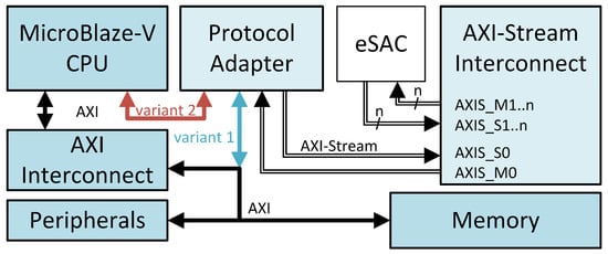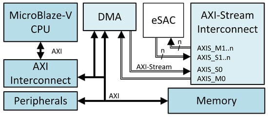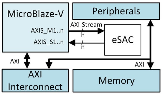 Given the interest of the industry and academic community in exploiting the RISC-V ISA, in this study, the CPU controlling the eSAC is the MicroBlaze-V soft-core processor from AMD [17]. Since the end of May 2024, release 2024.1 of the Vitis Integrated Software Platform has made the platform readily available in AMD’s Vivado Design Suite, facilitating quick system integration. The MicroBlaze-V soft-core processor is a reduced-instruction-set computer (RISC) optimized for implementation in AMD FPGA chips. It is highly configurable, allowing the system integrator to select the specific features required by the design. The base fixed feature set implements the RISC-V RV32I Base Integer Instruction Set and the machine-level ISA [2]. The MicroBlaze-V core IP also supports a tightly coupled AXI-Stream interface. For the designs presented in this paper, the instruction memory and data memory are accessible by the CPU through the Local Memory Bus (LMB) protocol defined by Xilinx (not shown in the figures). The size thereof was 32 KB each. A 32 KB BRAM component was also added in order to model the more common embedded microcontroller architecture comprising an on-chip SRAM connected to the main data bus (shown in the figures as ‘Memory’).