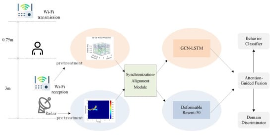 The fusion system architecture of this study is shown in Figure 1. The core objective is to enhance the robustness of human activity recognition in complex scenarios through the complementary nature of heterogeneous data from millimeter-wave radar and Wi-Fi CSI. The system hardware deployment adopts a distributed sensing model, where the FMCW radar and Wi-Fi router are arranged in a non-line-of-sight layout to cover the target activity area, ensuring the capture of multi-angle information. After preprocessing the raw radar echo signals and Wi-Fi CSI data, time synchronization is achieved through a hardware-triggered synchronization mechanism. These data are then fed into a parallel feature extraction network to generate modality-specific semantic features. Finally, through a scene-adaptive multimodal fusion strategy, robust behavior classification results across scenes are output. The process is as follows:
