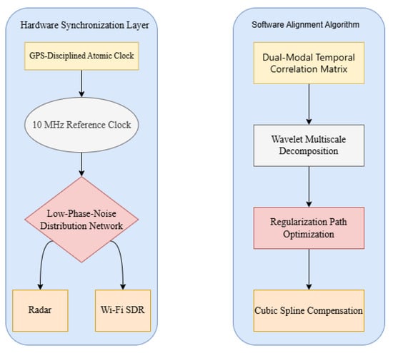 A GPS-disciplined atomic clock is used to generate a 10 MHz reference clock. A low-phase-noise distribution network drives the phase-locked loops of the millimeter-wave radar and Wi-Fi SDR. Device synchronization is achieved using nanosecond trigger pulses, with time reference alignment error ≤ 1 μs.