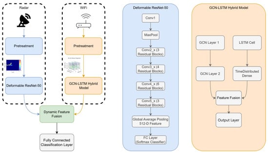 The network adopts a dual-branch dynamic fusion architecture as shown in Figure 4. The radar branch uses Deformable ResNet-50 as the backbone, with a 256 × 256 time-frequency spectrogram as input. It employs deformable convolutions to adaptively extract micro-Doppler features, outputting a 512-dimensional feature vector. The Wi-Fi branch constructs a GCN-LSTM hybrid model, mapping the 3 × 34 × 10 dimensional CSI tensor into a spatiotemporal graph. After three layers of graph convolution to aggregate spatial features, the data is fed into a bidirectional LSTM to capture temporal dependencies, ultimately outputting a 512-dimensional semantic vector. The multimodal fusion uses a conditional batch normalization mechanism, dynamically modulating the feature contributions with attention weights γ WiFi and γ radar generated by the Wi-Fi branch as follows: