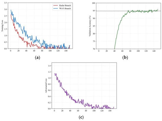Figure 5. Learning curves across different training phases. (a) Training loss curves of radar and Wi-Fi branches. (b) Cross-scene validation accuracy. (c) Domain adversarial loss evolution.