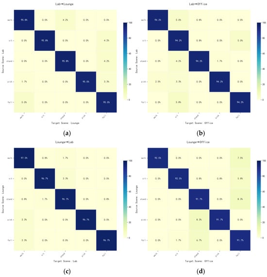 Our method complements radar’s micro-motion sensitivity with Wi-Fi’s wide coverage characteristics, allowing radar signal attenuation to be compensated by the phase gradient features of Wi-Fi. This approach breaks through the physical limitations of single sensors and achieves cross-environment robustness by using a dynamic fusion mechanism with cross-modal complementarity and scene adaptability. The transfer effects in different scenes are shown in Figure 6. The overall accuracy of our method remains between 92.1% and 96.9%. Data analysis reveals that fall detection generally suffers from misclassification with sitting and standing actions, which may be caused by overlapping time-frequency features between the sitting-to-ground phase and the fall-prevention buffering actions in the acceleration signal. Additionally, dynamic scene transfer did not cause systemic misclassification spreading, such as walking–sitting and standing–picking actions, with no cross-category confusion observed. This proves that the multimodal feature extraction module can effectively decouple core motion patterns.