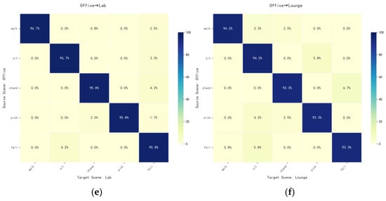 Figure 6. Confusion matrix for different scenes. (a) Lab → Lounge. (b) Lab → Office. (c) Lounge → Lab. (d) Lounge → Office. (e) Office → Lab. (f) Office → Lounge.