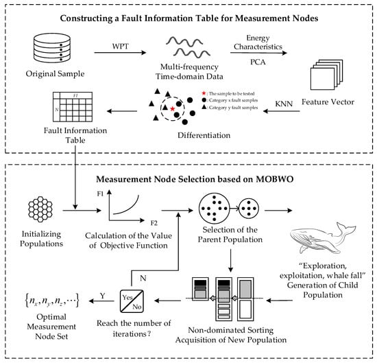 The process of constructing the fault information table is as follows. Firstly, a three-layer wavelet packet transform (WPT) is carried out on the original signal, and the energy of the third-layer wavelet packet is calculated as the sample features. Secondly, linear dimensionality reduction is carried out on the energy feature data by principal component analysis (PCA) to obtain the feature vector that contains most of the effective information. Again, the K-nearest neighbors (KNN) algorithm is utilized to classify and predict any two types of faults under each measurement node to obtain the differentiation between faults. Then, the differentiation degree of each measurement node for each type of fault category information is calculated by combining formulae, and the measurement point fault information table is constructed. Finally, the differentiation degree of each measurement node for each type of fault is calculated by combining the formula, and the measurement node fault information table is constructed. Based on the measurement node fault information table, the MOBWO algorithm is utilized for the selection of measurement nodes under multi-objective scenarios, and the trade-off between the number of measurement nodes and the fault information is realized through the design of individual coding, genetic operator and fitness target, and, finally, the optimal set of measurement points is obtained.