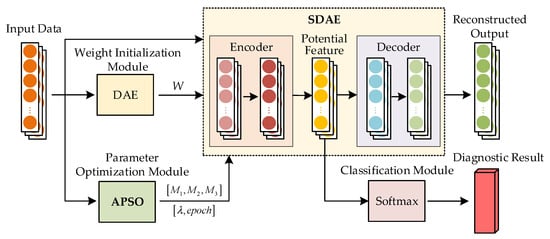 As shown in Figure 3, the weight initialization module uses the hierarchical pre-training process of denoising autoencoder (DAE) to obtain the weight W, which is input to the SDAE module as the initial value of the weights between the layers; in the parameter optimization module, an SDAE hyperparameter optimization method based on the APSO algorithm is proposed to obtain the better value of parameter combinations by comparing the failure rate of the classification prediction; finally, a Softmax layer is introduced as a classification module to accomplish the task of fault classification for the raw data of analog circuits.