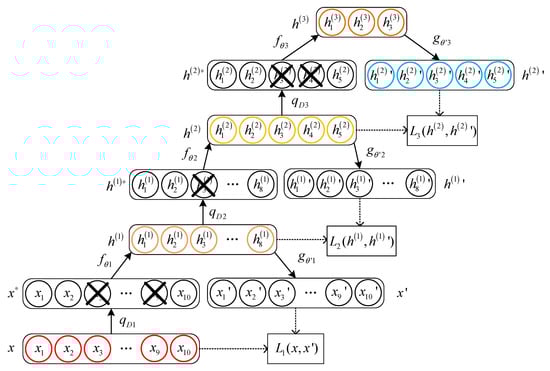 In Figure 4, x represents the original input data; , , and represent the introduction of noise operations for each DAE layer; , , and represent potential spatial representations; , and represent the reconstructed output data. During the DAE hierarchical pre-training process, each DAE model separately performs an encoding operation and a decoding operation on the broken data after the introduction of noise and updates the weight parameters based on the loss function between the input and the reconstructed output. After the pre-training of all DAEs, the weight matrix of the SDAE model is initialized using the weight parameters in the encoding function and decoding function obtained from the pre-training.