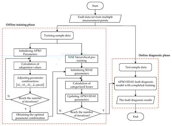 The process of fault diagnosis for analog circuits based on APSO-SDAE is divided into two phases: offline training and online diagnosis, as shown in Figure 6. In the offline training phase, the APSO algorithm calculates the fitness value of each particle (each parameter combination) based on the training sample data and obtains the optimal parameter combination by taking the minimum of the classification prediction failure rate as the optimization goal, then the SDAE model is initialized based on the four parameters of the weights, the number of neurons in the implicit layer, the learning rate, and the number of training rounds. The weights of the APSO-SDAE model are updated layer by layer according to the classification loss, and, finally, the trained fault diagnosis model is obtained. In the online diagnosis stage, the test sample data are input into the APSO-SDAE fault diagnosis model to obtain the diagnosis results of the soft fault of the circuit under test.